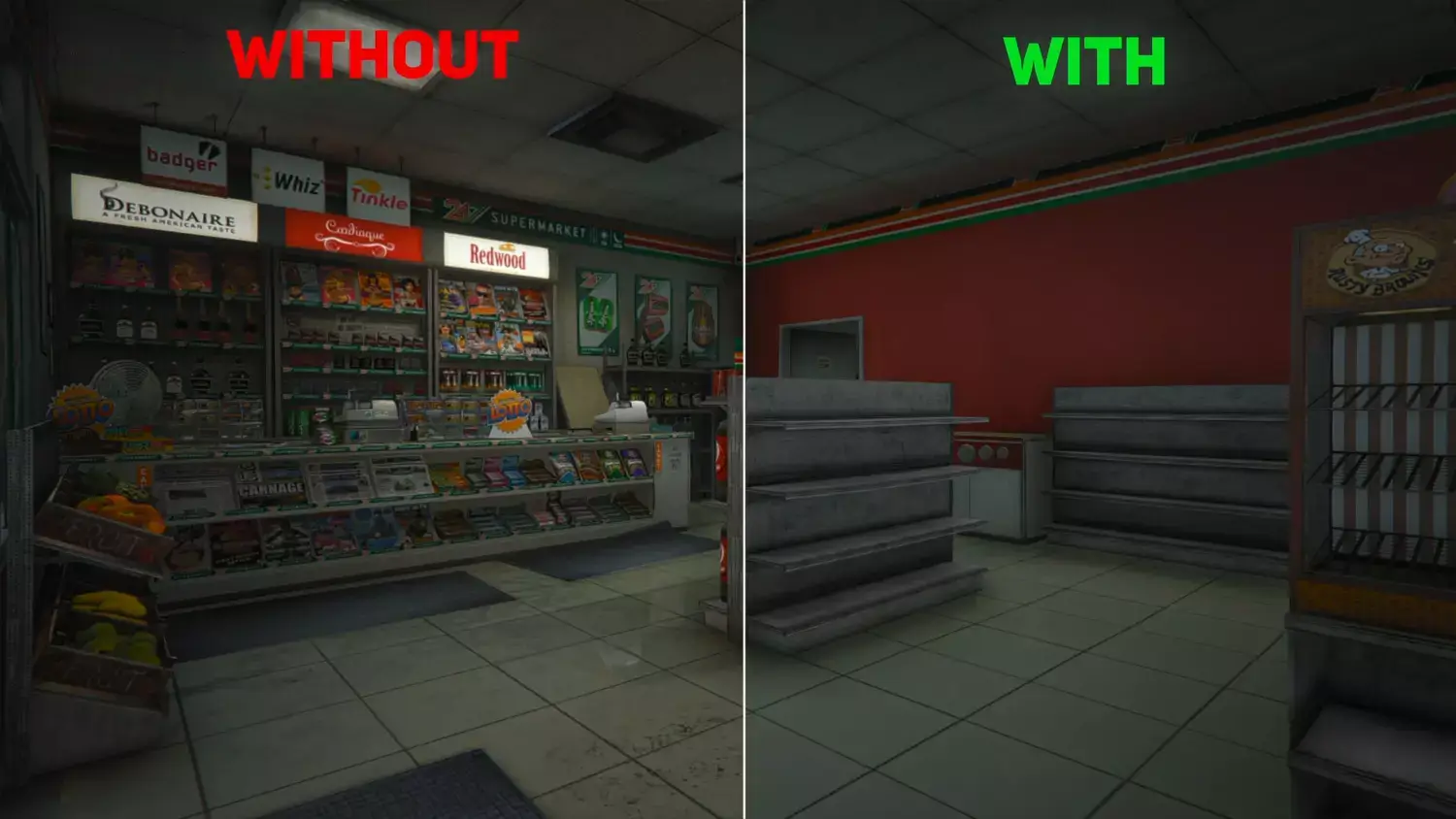 - Оптимизированные интерьеры — из магазинов 24/7 убраны товары (не дают игрового преимущества, но снижают FPS)